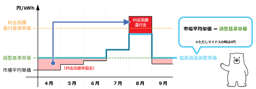 市場価格が高騰した際には、事前に蓄えた準備金の一部を還付金として充当し、電気料金の急激な上昇を抑制します。例えば、市場価格が1kWhあたり30円に上昇した場合、通常なら5.50円(30円 - 24.50円)の値上げとなりますが、準備金から還付することで、実際の値上げ幅を抑えます。