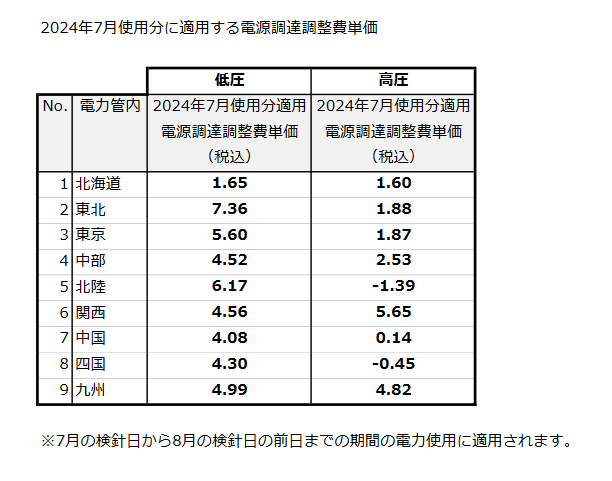 2024年7月の電源調達調整費の単価は下記のとおりでした。